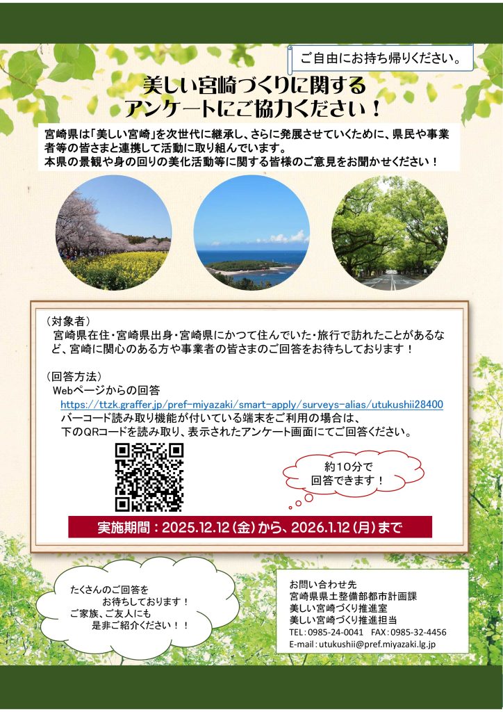 宮崎県では、「美しい宮崎づくり推進計画」を基に、「美しい宮崎づくり」を実施しています。そこで、宮崎県の景観や身の回りの美化活動などに関する県民等の皆様のお考えをお聞きするため、以下のアンケート調査を実施します。ご協力をお願いします。