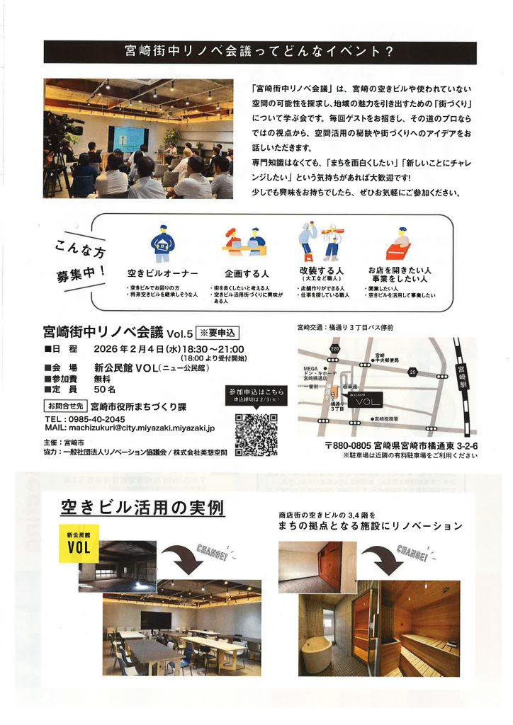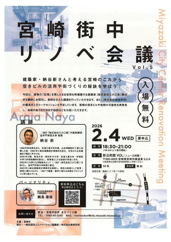 宮崎市では、宮崎街中リノベ会議Vol.5を開催します。今回は、建築家の納谷 新 氏(株式会社360度)を講師に招いて、宮崎の空きビルの活用や街づくりの秘訣について学びます。