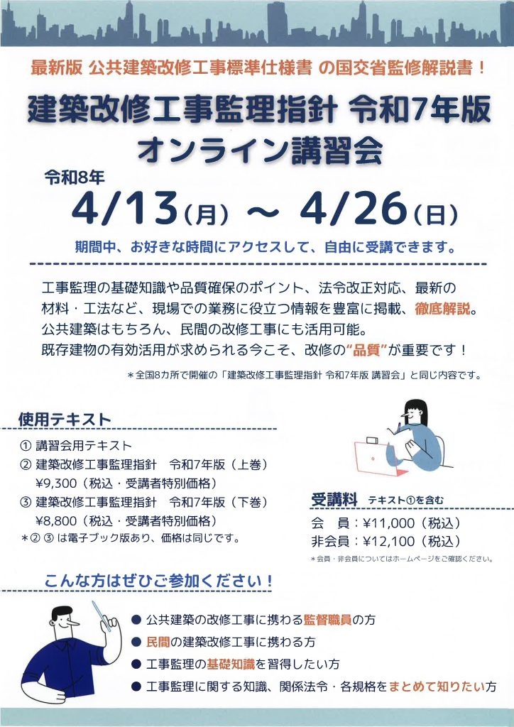 【お知らせ】建築改修工事監理指針 令和7年度版 オンライン講習会の開催について