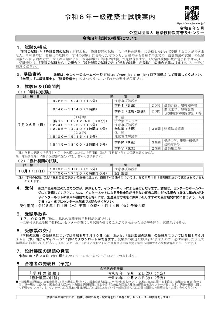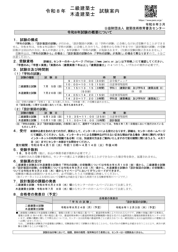 (公財)建築技術教育普及センターが、一級建築士、二級建築士及び木造建築士の令和8年度試験案内を公表しましたのでお知らせします。お近くの受験希望の方にご案内ください。