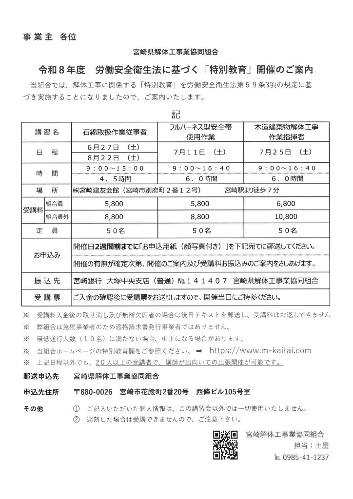 宮崎県解体工事業協同組合では、令和8年度労働安全衛生法に基づく「特別教育」として、解体工事に関する講習会を開催します。 受講を希望される場合は、添付の申込書に必要事項をご記入のうえ、同組合にお申し込みください。