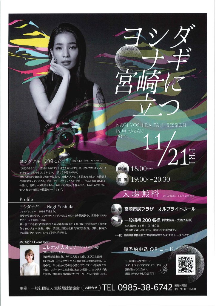 (一社)宮崎県建築協会では、創立30周年を記念して、11月21日(金)にフォトグラファー・ヨシダナギ氏をお迎えして講演会「ヨシダナギ トークライブ ~ 自分らしい色で、生きていく ~ 」を開催します。