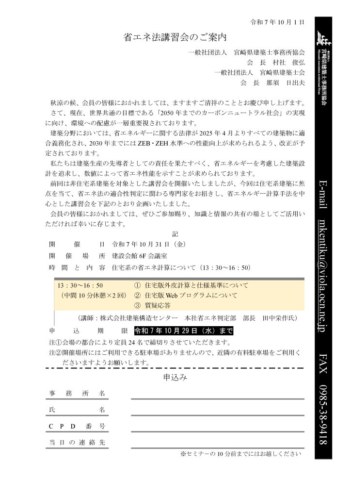 事務局からのお知らせ 【ご案内】省エネ法講習会の開催について 2025.10.01 (一社)宮崎県建築士事務所協会では、省エネ法の適合判定に関わる専門家を招いて、住宅系建築に焦点を当てた省エネ計算手法を中心とする講習会を開催します。是非ご参加ください。 Post Share RSS 【休業のお知らせ】令和7年10月30日(木)事務局を...
